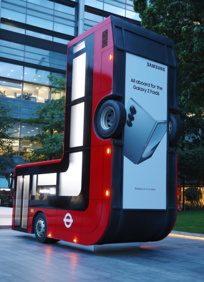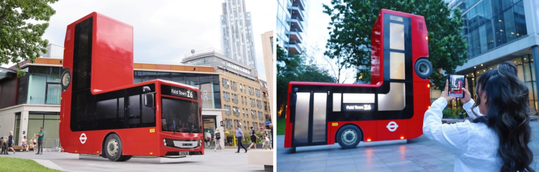 이 캠페인에서 가장 눈에 띄는 것은 삼성전자 영국 법인은 런던교통국 Transport for London(TFL)과 협업하여 만든 빨간 런던 버스입니다. 예술가 캐스퍼 필립스는 런던 비숍 스퀘어(현재는 폴드 스퀘어라는 별명으로 불림)에 가로 6m, 세로 6.2m의 빨간 버스를 폴더블 폰처럼 90도 각도로 접어서 설치했습니다. 실제 런던에서 운행되던 버스를 재활용해 만들었으며, 설계와 제작에만 총 2개월이 걸렸습니다. |