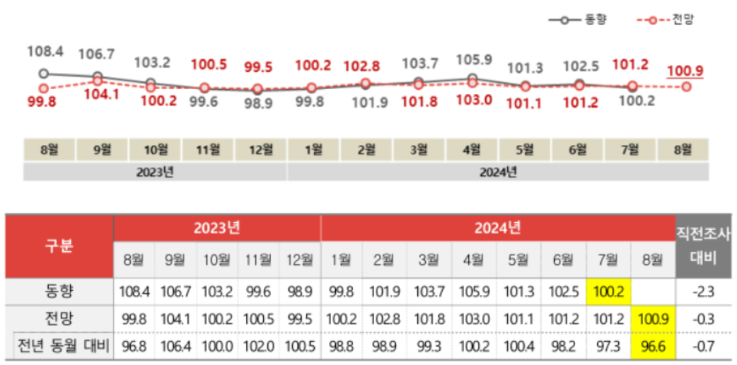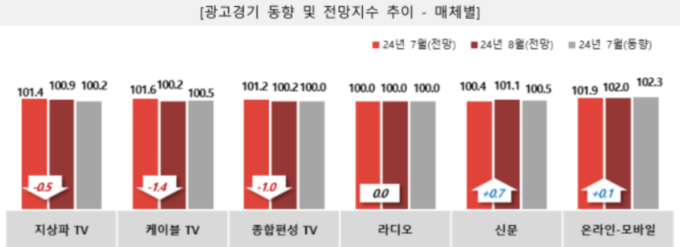 2024년 7월 대비 8월의 전망지수는 100.9로 광고비 집행이 전월에 비해 소폭 증가할 것으로 나타났습니다.