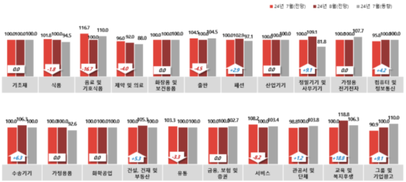 2024년 8월 전망지수가 가장 낮은 업종은 ‘제약 및 의료(92.0)로 조사되었고, 2024년 7월 동향지수는 ‘음료 및 기호식품’과 ‘그룹 및 기업광고(각각 110.0)’, ‘가정용 전기전자(107.7)’, ‘교육 및 복지후생(106.3)’ 등의 순으로 높게 나타났습니다. |
