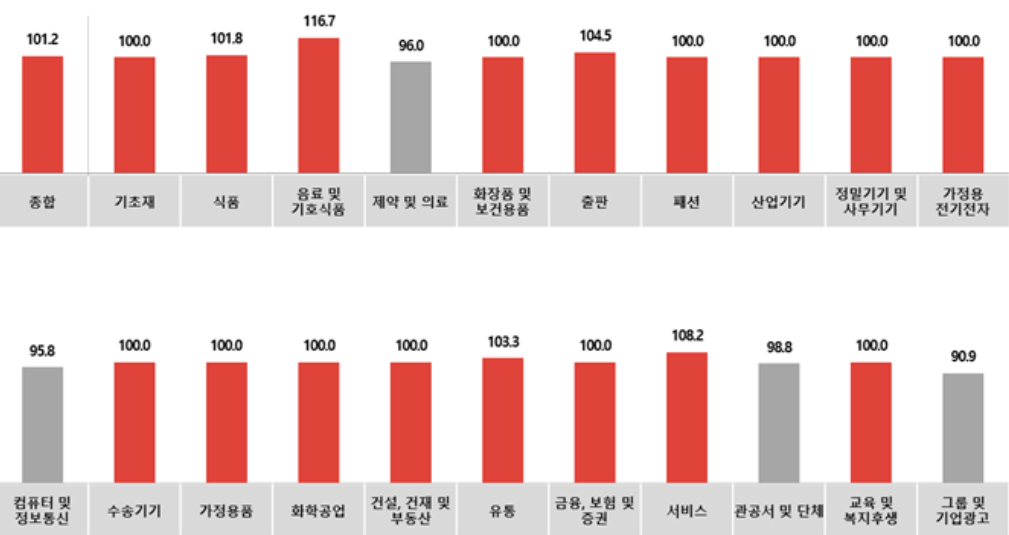 업종별로는 커피, 아이스크림 등 ‘음료 및 기호식품(116.7)’, 치킨 프랜차이즈 등 ‘서비스(108.2)’, 학습 도서 등 ‘출판(104.5)’ 업종에서 광고비 집행이 늘어날 것으로 전망됐습니다.