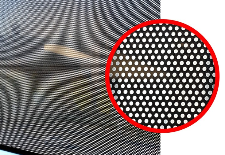 원웨이 필름의 경우, 캘린더 필름 자체에 2.5mm의 타공 구멍이 있기 때문에 인쇄면에는 그래픽을 인쇄하고 점착면은 검정색 점착제를 사용, 안에선 밖이 아주 잘 보이며 외부에서는 그래픽이 보이는 광고효과를 누릴 수 있습니다. |