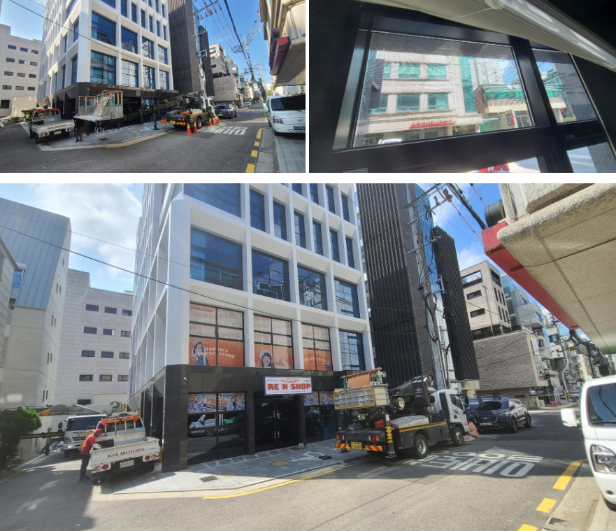 건물의 랩핑 종류에는 다양한 종류의 필름 또는 현수막을 사용하는데요, 이번에 진행한 랩핑광고는 원웨이필름을 사용한 타공랩핑광고입니다.