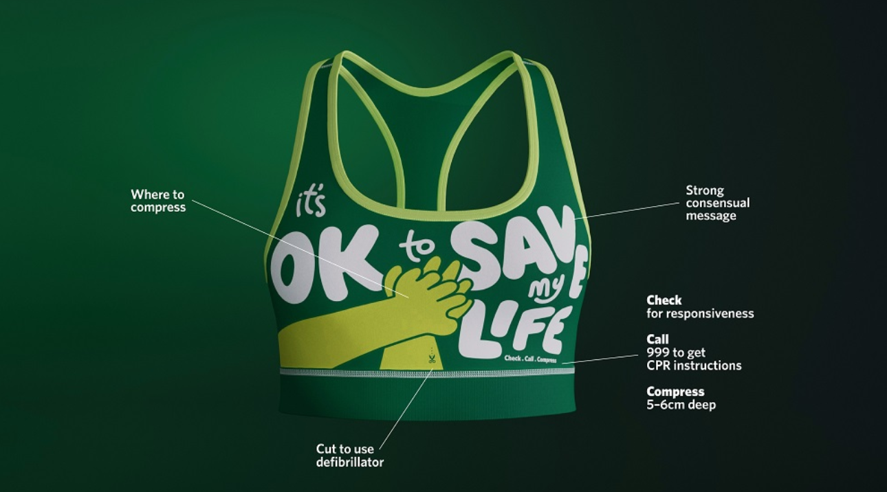 세인트존 앰뷸런스는 여성들이 직면한 문제에 대한 인식을 높이기 위해 첼시 FC 여자 주장 밀리 브라이트, 방송인이자 DJ인 애슐리 제임스, 소셜 콘텐츠 크리에이터이자 장애인 운동가인 루시 에드워즈, 활동가 샤론 가프카가 힘을 합쳐 세계 최초의 교육용 브래지어인 CPR 브라를 출시하는 캠페인을 시작했습니다. 이 브래지어는 성별에 관계없이 생명을 구하기 위해 빠른 조치를 취하는 것이 옳은 일이라는 것을 알리기 위해 제작되었으며, 앞면에는 '내 생명을 구해도 괜찮'라는 메시지와 함께 심정지 발생 시 대응하는 데 필요한 단계가 적혀 있습니다. |