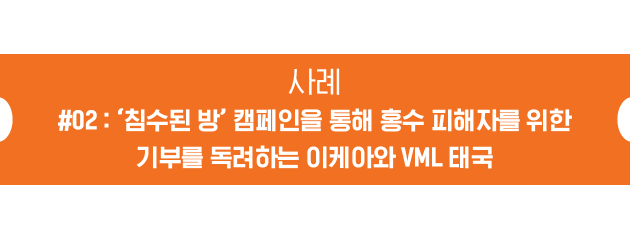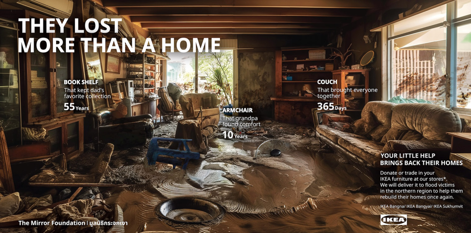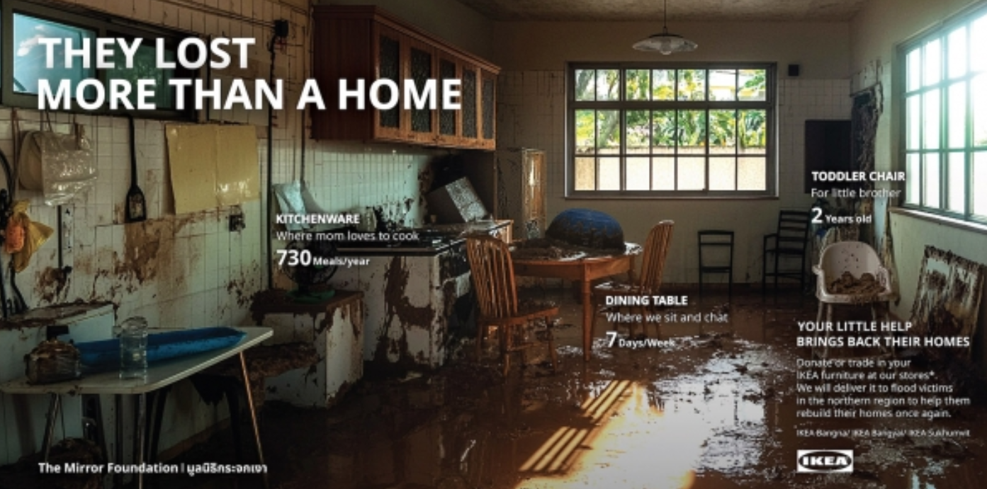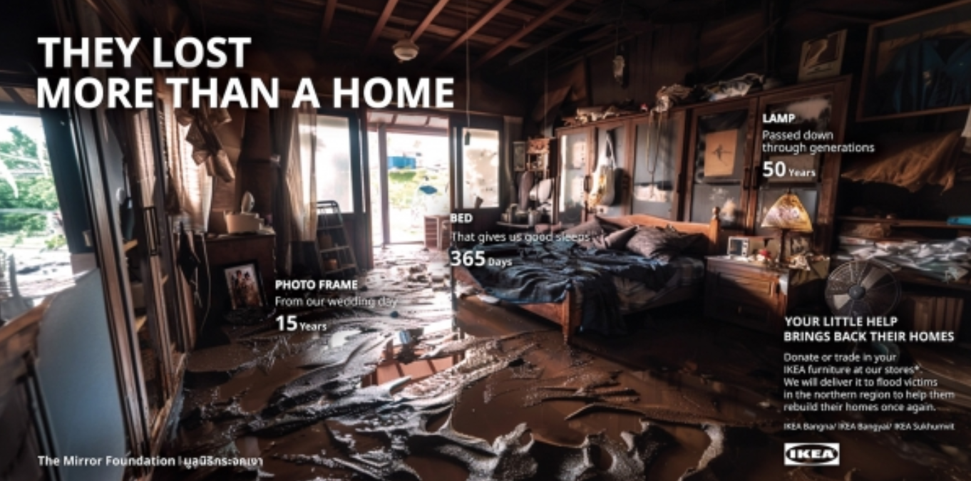 태국 북부는 최근 30년 만에 최악의 홍수를 겪었고, 홍수와 진흙이 집과 생계를 파괴하면서 수천 가구가 황폐해졌습니다. 이 위기에 대응하여 이케아 태국은 광고대행사 VML 태국과 협력하여 ‘침수된 방(Flooded Room)’ 캠페인을 시작하여 지역 사회를 재건 노력에 힘을 합쳤습니다. 이 이니셔티브는 피해를 입은 사람들이 그러한 파괴의 여파 속에서 회복하고 희망을 회복할 수 있도록 지원과 자원을 제공하는 것을 목표로 했습니다. |