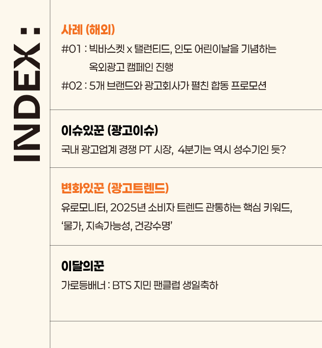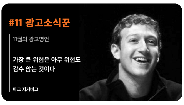 매년 힘들지 않은 시기가 없었다고 하지만, 올해는 특히 조금 더 힘들었다는 것이 업계의 공통된 이야기입니다. 4분기는 광고주도 바쁜 시기이지만, 광고회사들은 막바지 실적 체크와 인사평가를 통한 임직원 인사이동, 조직변경 등 조직 정비로 성과를 낼 수도 있습니다. 이에 우리 광고업계는 여태까지 잘 극복해왔듯이 다 함께 마지막까지 최선을 다해서 올해도 잘 극복하리라 기대해봅니다. |