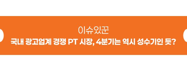 올해 국내외 환경 및 경제상황의 불안정으로 위축된 광고업계 및 경쟁 PT 시장이 3분기까지 침체한 모습이었지만, 4분기가 시작되면서 경쟁 PT 시장이 꿈틀거리는 분위기입니다. 3분기까지의 쉽지 않은 광고업계 시장에 4분기가 되면서 경쟁 PT가 다소 활성화되며 숨통이 트이는 모습이라고 업계는 전하고 있지만, 광고주들의 광고 마케팅 관련 소극적인 태도는 아직 여전한 실정입니다. 광고회사들은 연말을 앞두고 실적관리와 함께 내년도 사업을 위한 준비 하고 있는데, 경쟁 PT는 2025년을 겨냥하고 있는 터라, 그나마 활성화 된 모습을 보인다고 할 수 있겠습니다. |