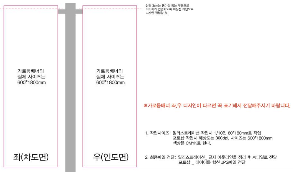 배너 한개당 사이즈는 60Cm X 180Cm로서 배너 2장 1세트로 진행되고 있으며, 이 1세트를 1조라고 하는데요, 가로등배너의 설치시간은 현장상황에 따라 탄력적으로 진행하며, 배너는 일반적으로 금요일 저녁 설치 - 토요일 보존 - 일요일 철거를 기준으로 합니다.