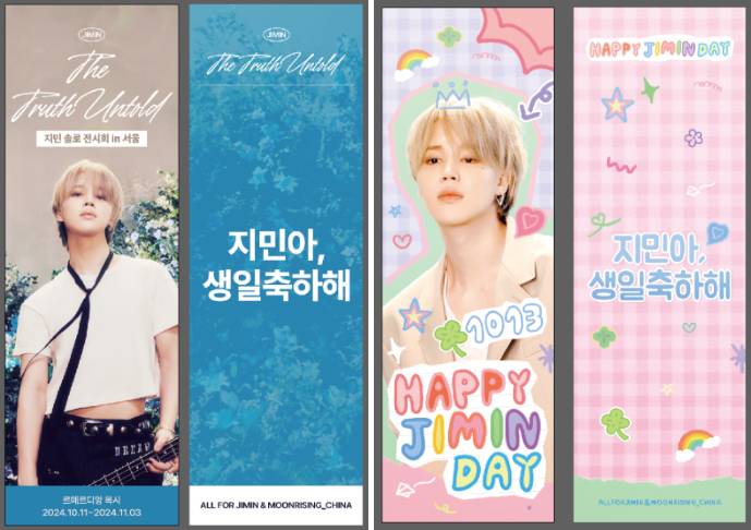 이번 가로등배너는 홍대와 명동, 그리고 경기도 연천에서 진행되었는데요, 첫 번째 시안은 지민의 카리스마를 살린 이미지를 활용, 생일축하메시지와 함께 '지민 솔로 전시회 IN 서울'에 대한 내용까지 담아내었고, 두 번째 시안은 핑크색 배경에 파스텔톤 이미지를 활용하여 지민의 귀여운 모습과 생일축하메시지를 샤방샤방하게 담아내었습니다.