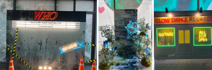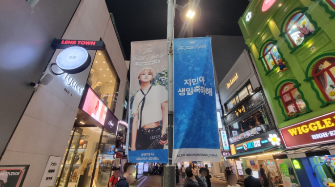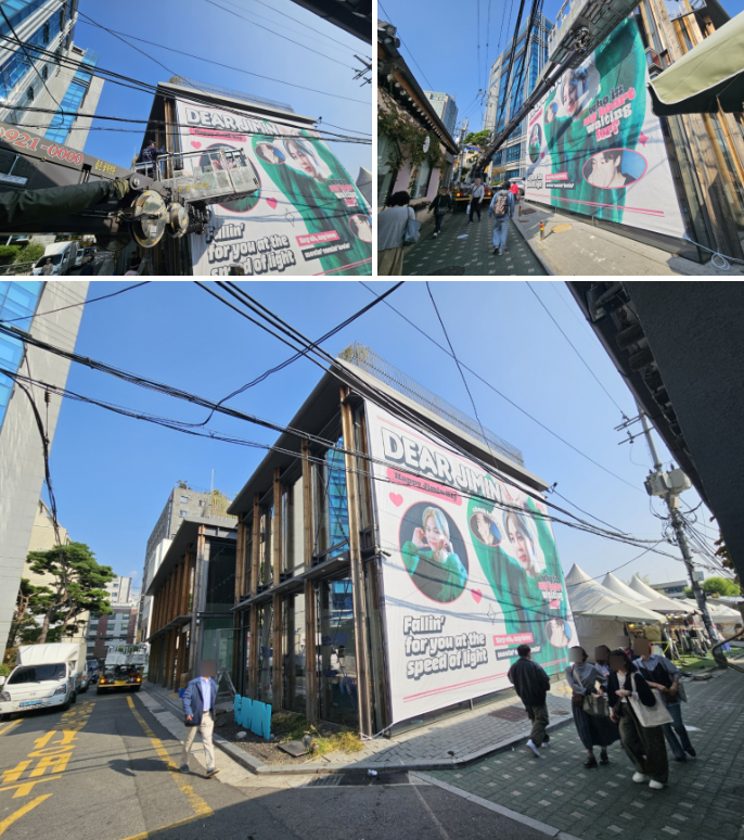 가로등 배너와 함께 진행된 건물 현수막, 그리고 시트지 작업은 지민의 29번째 생일파티가 열리는 종로구 익선동 누디트 익선 팝업에서 진행되었습니다. |