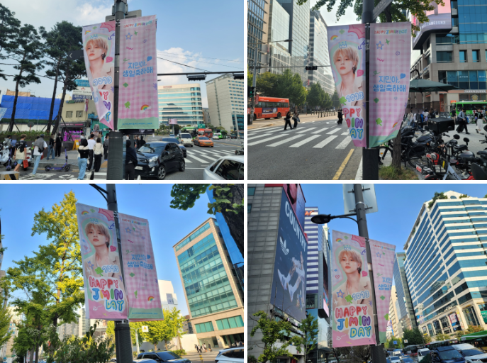 우선 팬클럽들이 BTS지민의 생일축하를 위해 진행한 가로등배너에 대해 말씀드려야겠죠? |